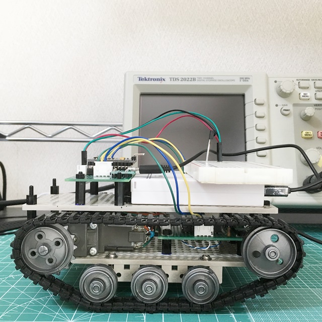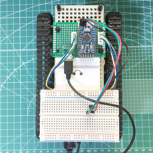 モバイルバッテリーはちょうど制御回路とシャーシーのねじの間に嵌まって固定される形になっています。赤外線センサのブレッドボードは載せているだけです。